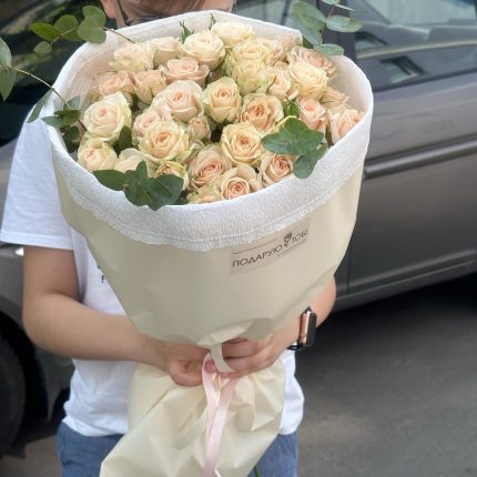 Букет из 11 персиковых мини-гербер и зелени в дизайнерской упаковке “Персиковые бабочки”
