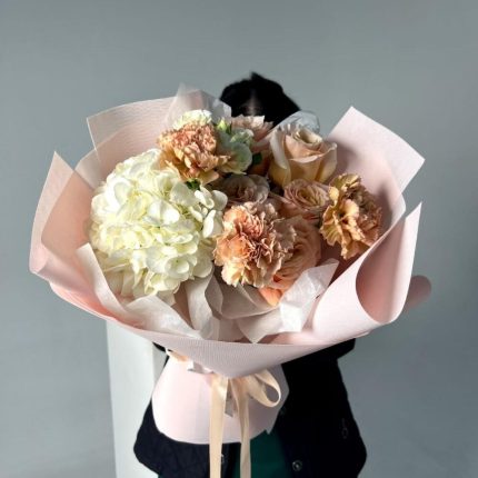 Бархатный цилиндр из голубых диантусов, розовых пионов и ароматной маттиолы