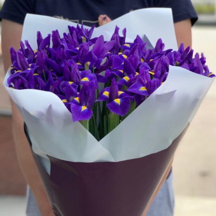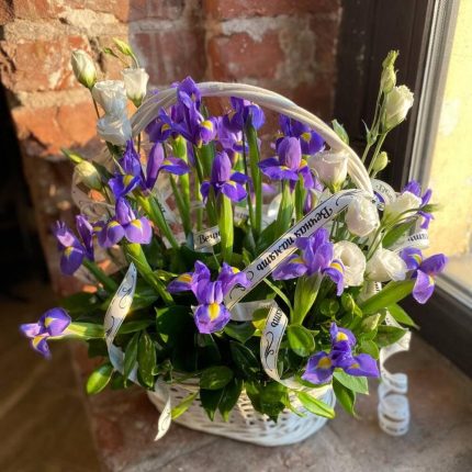 Букет из ирисов, лимониума, кустовых хризантем и самшита в шляпной коробке “Канберра”
