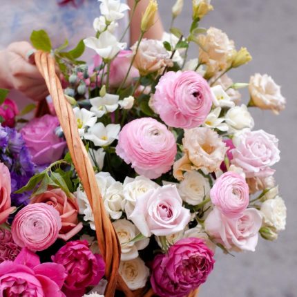Цветы в большой коробке: садовые розы, лизиантус, маттиола, тюльпаны