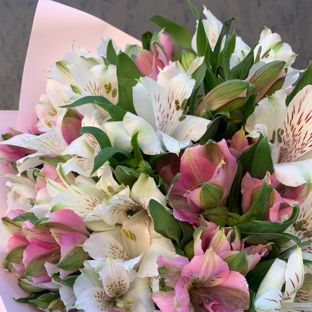 Букет из 25 розовых и белых альстромерий в стильной упаковке
