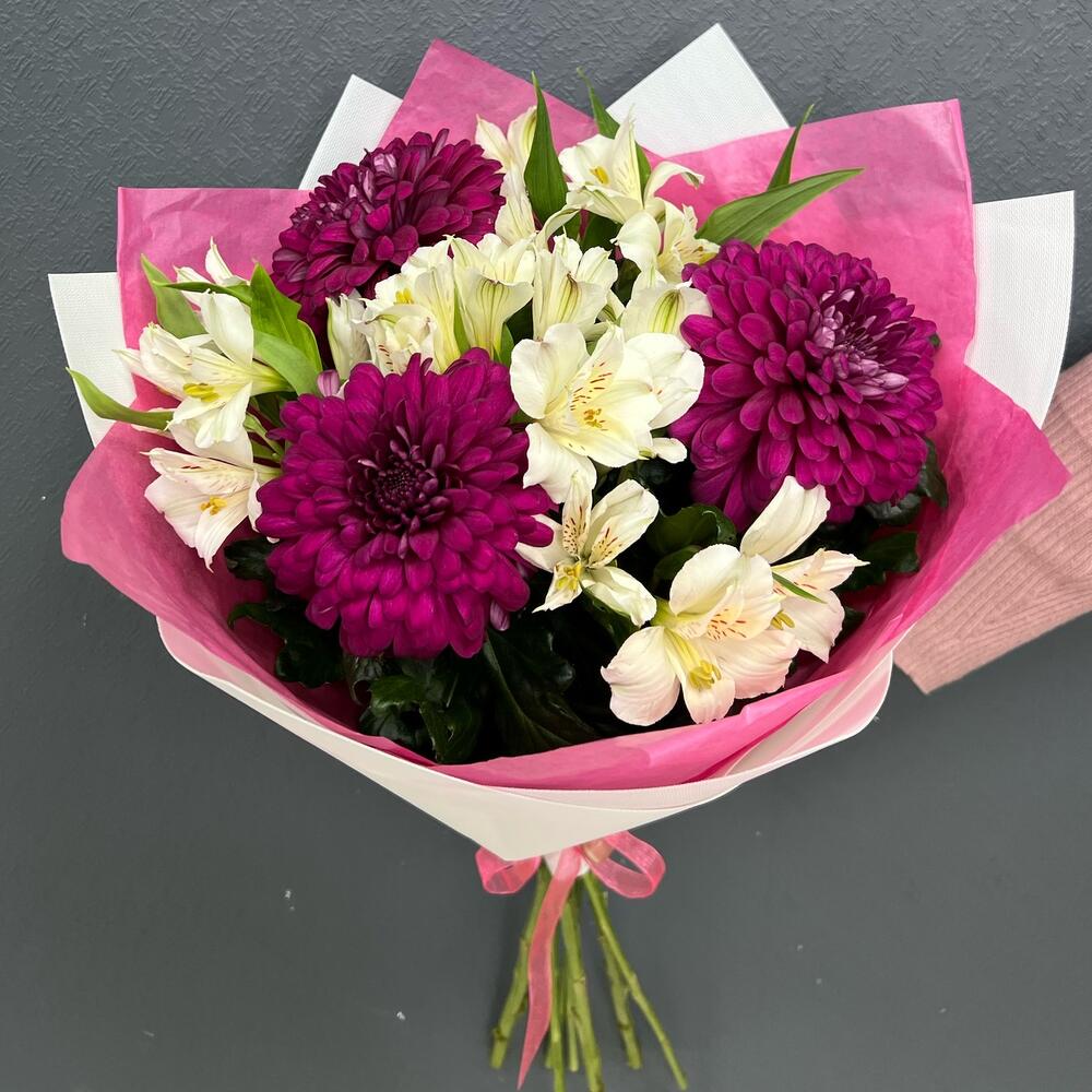 ламира – 3 шт.Альстромерия – 4 шт.Тишью – 2 шт.Пленка матовая – 2 шт.Лента атласная – 2 шт.