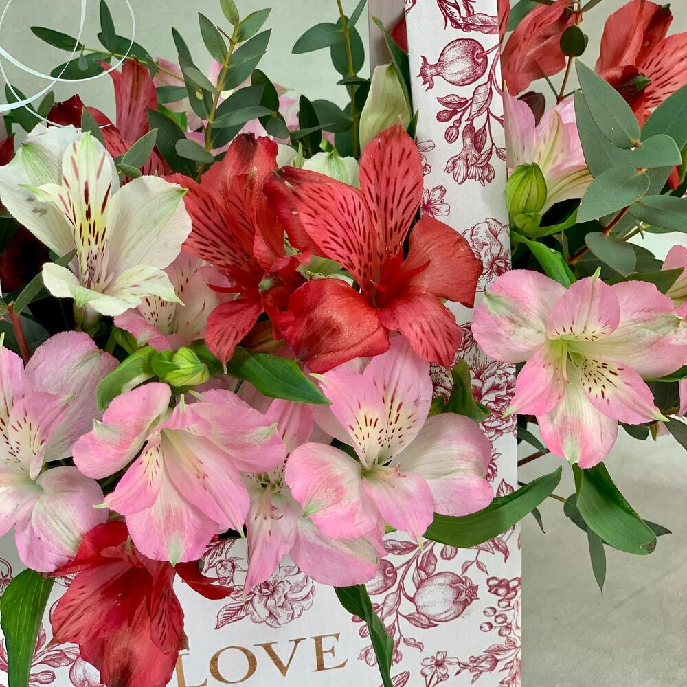 Альстромерия – 8 шт.Эвкалипт – 2 шт.Оазис флористический – 1 шт.Сумка картон – 1 шт.
