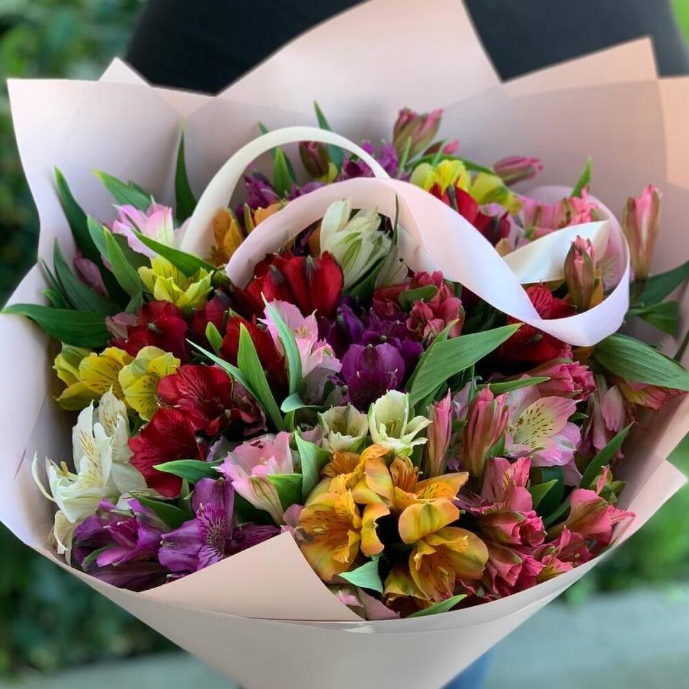 Альстромерия – 21 шт.Упаковка дизайнерская – 1 шт.Лента атласная – 1 шт.