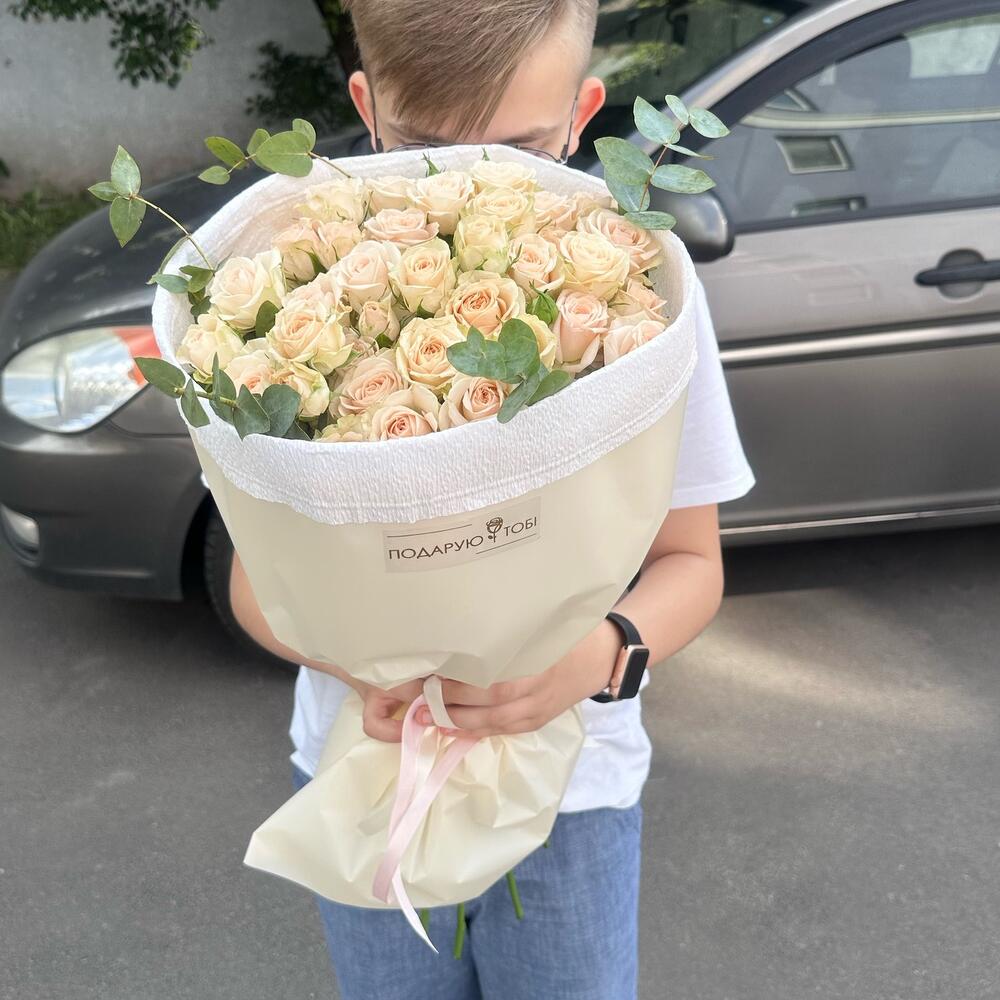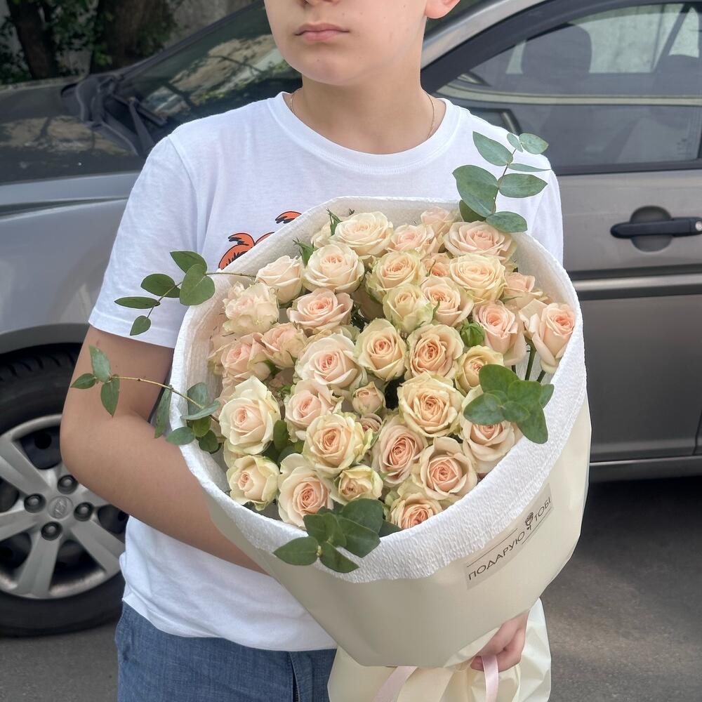 11 пионовидных кустовых роз + эвкалипт