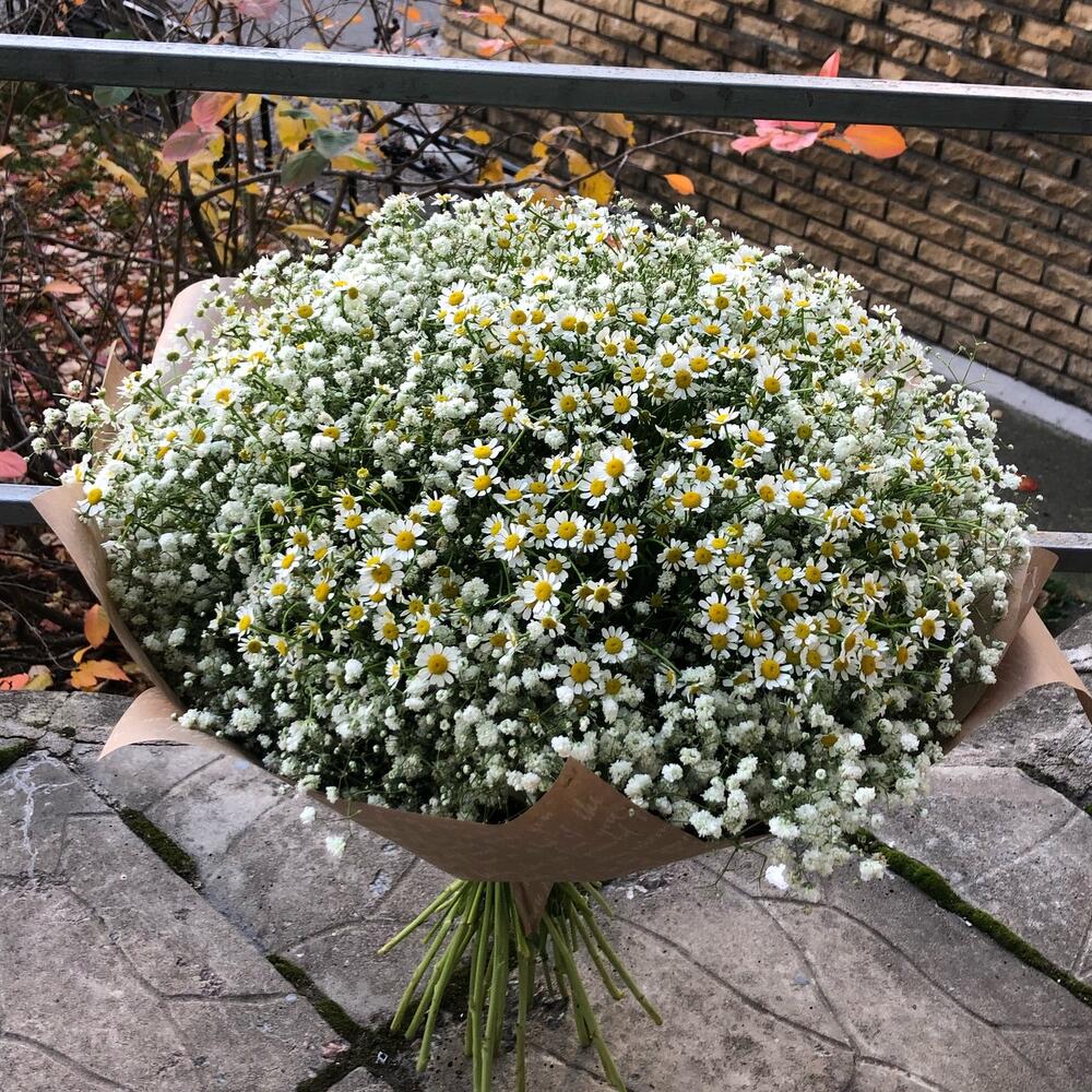 Матрикария (Ромашка Камила) – 15 шт.Гипсофила – 6 шт.Упаковка – 3 шт.