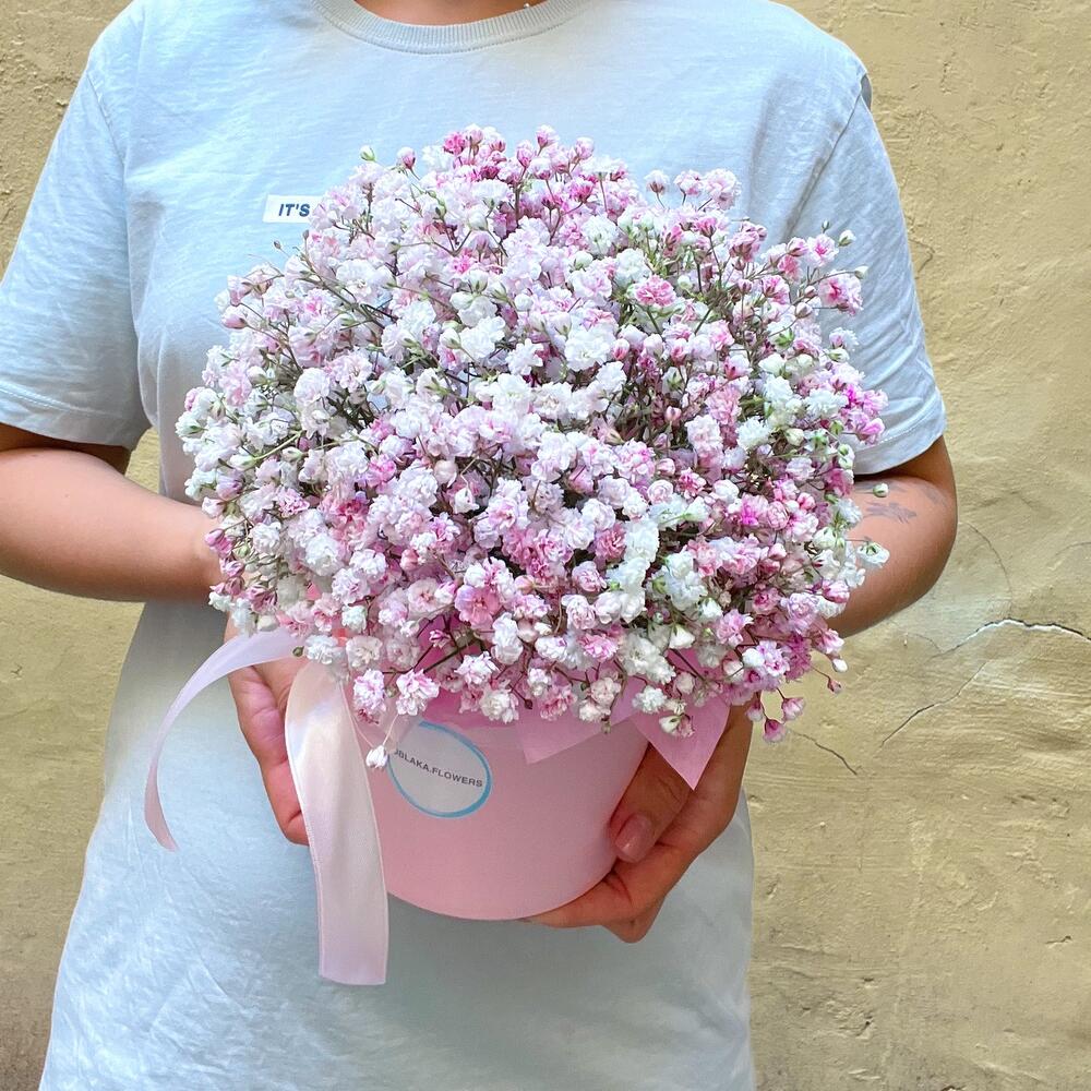 “Сиреневый туман” – композиция из гипсофилы в шляпной коробке