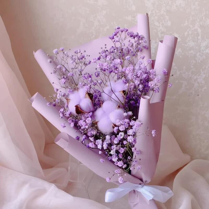 Хлопок – 3 шт.Лента атласная – 1 шт.Гипсофила фиолетовая – 1 шт.Дизайнерская упаковка – 1 шт.