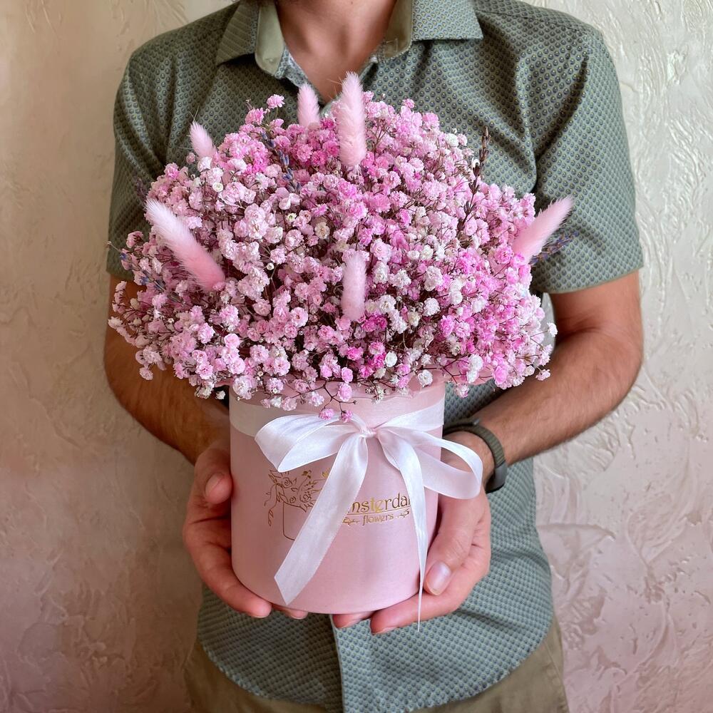 Нежная стойкая композиция из розовой гипсофилы с сухоцветами. Для самых взыскательных особ.