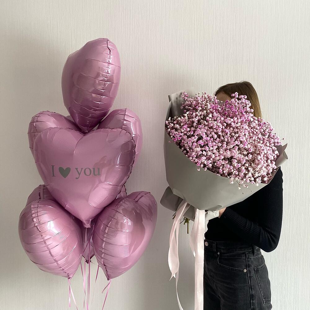 Гипсофила розовая – 13 шт.Сердца фольгированные – 7 шт.