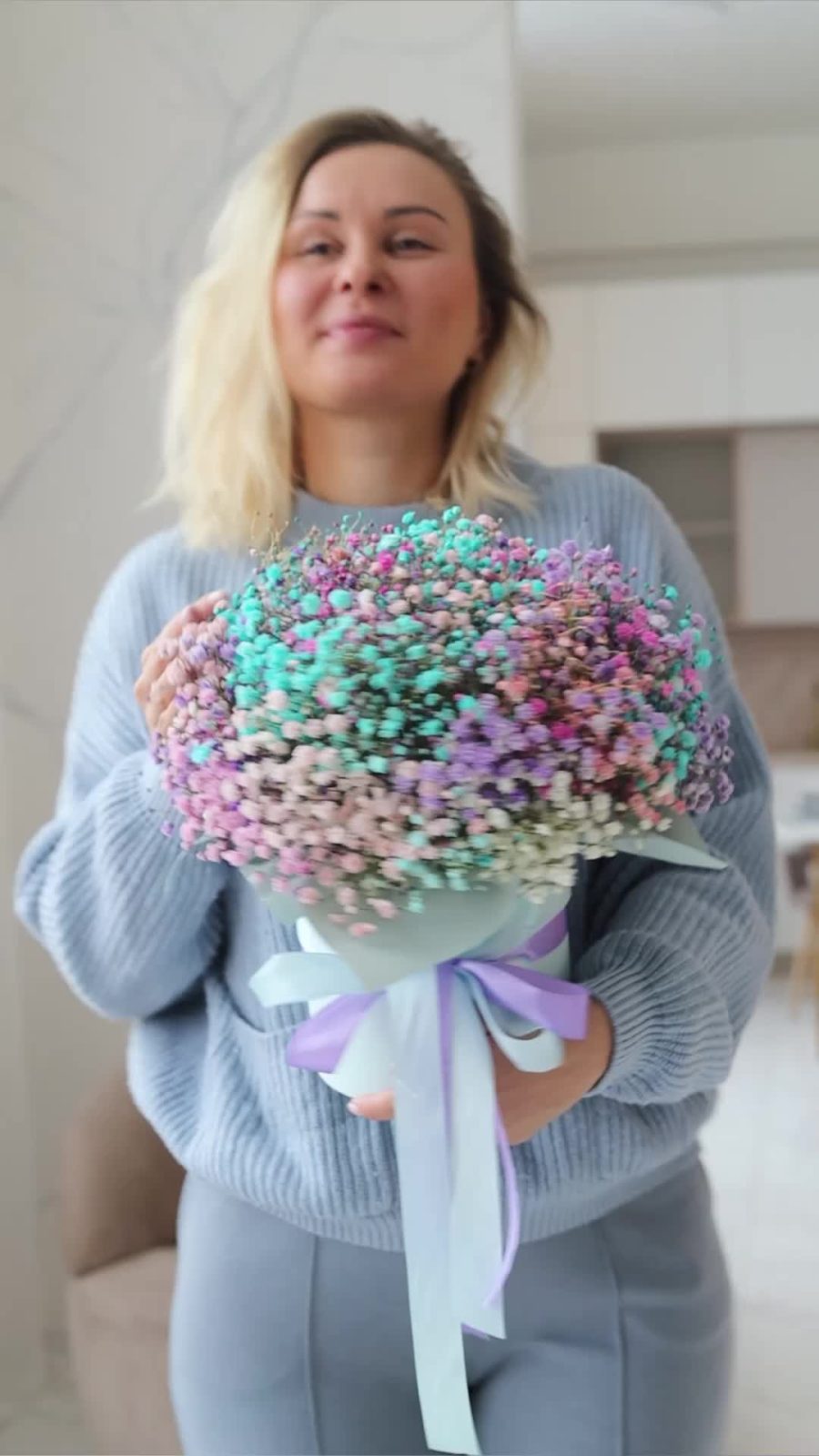 Лента атласная – 2 шт.Коробка шляпная – 1 шт.Оазис флористический – 2 шт.гипсофила радужная – 9 шт.