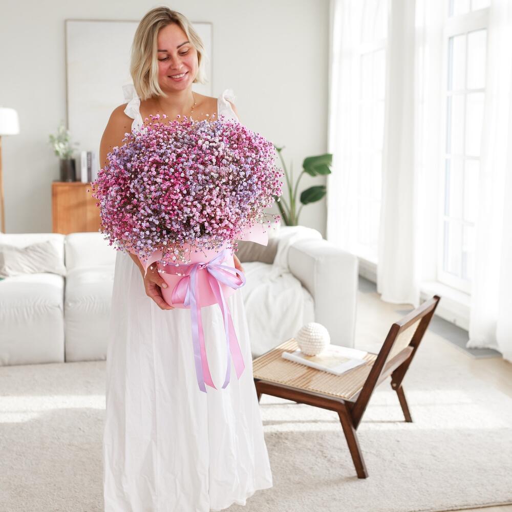 Очаровательная, воздушная композиция из гипсофилы, в шляпной коробке.Цветы стоят в специальной флористической губке,что позволяет им больше оставаться свежими и радовать получателя. Так же композиция в коробке это очень удобно и эффектно, так как не надо ставить букет в вазу и менять воду. Необходимо лишь подливать в губку воду.Инструкция по уходу за цветами прикреплена к каждому заказу.Цветы гипсофилы отличаются стойкостью и даже при высыхании не теряют, декоративности и цвета. Что позволяет, долгое время украшать интерьер в качестве сухоцветов.Подпишем открытку с вашими пожеланиями бесплатно