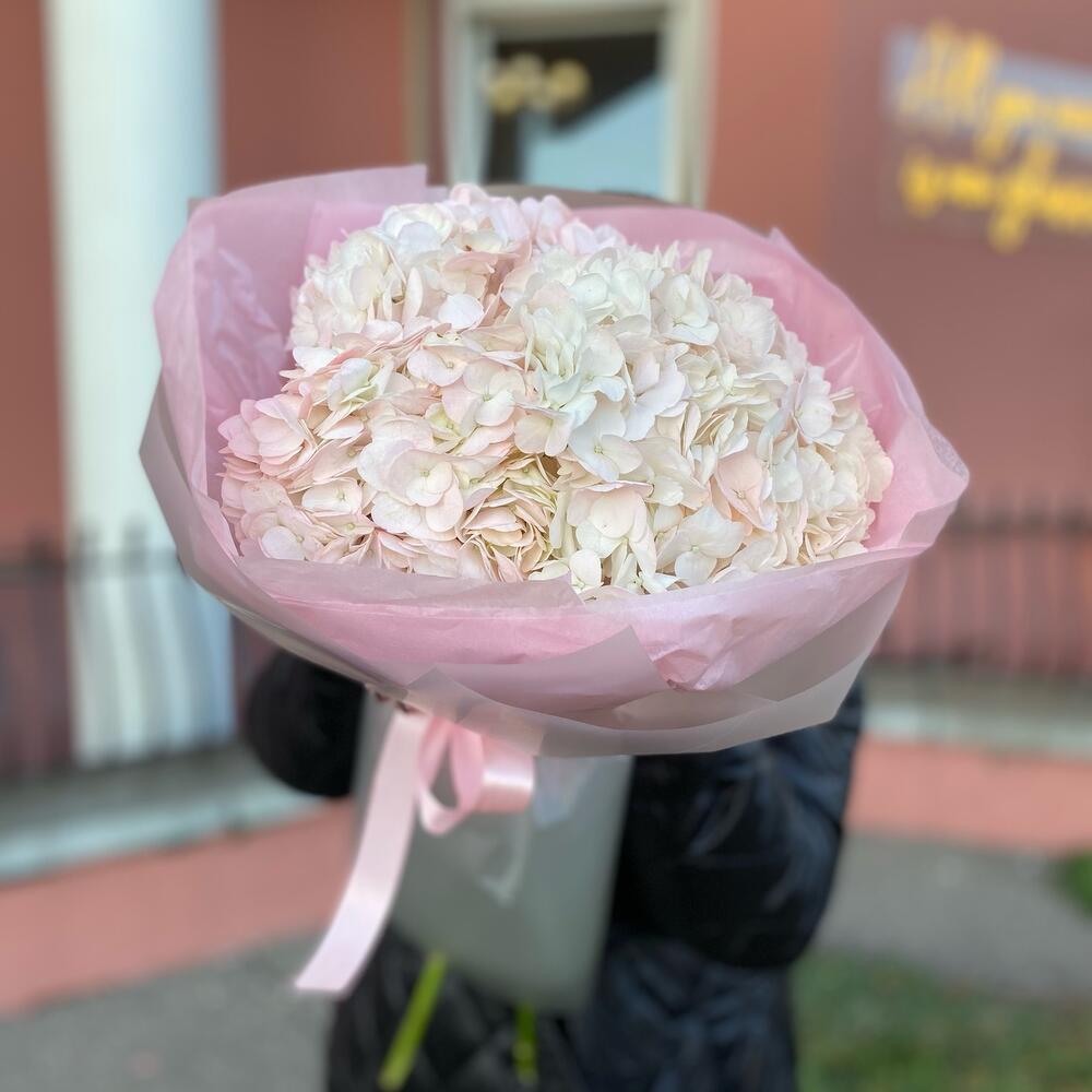 Гортензия – 3 шт. Атласная лента – 1 шт. Тишью – 1 шт. Пленка дизайнерская – 1 шт.