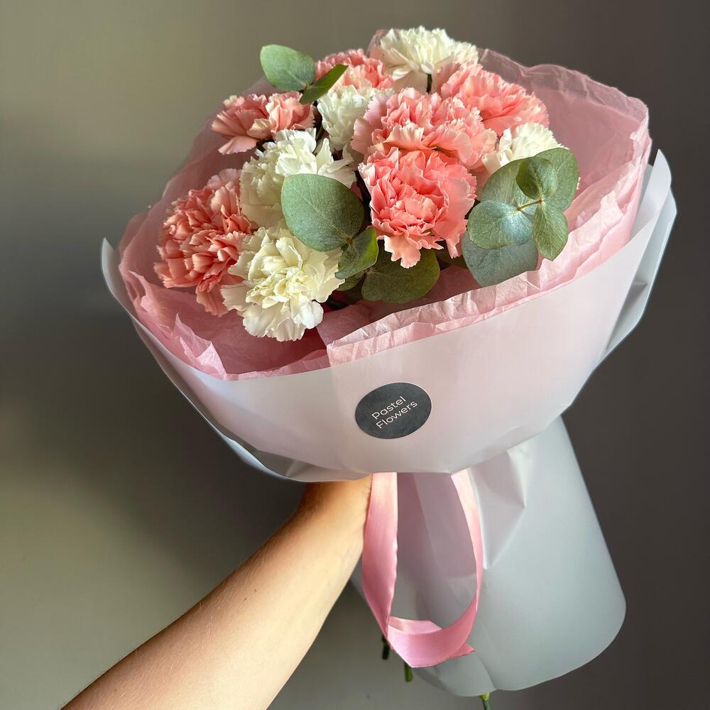 Гвоздика белая – 5 шт. Гвоздика розовая – 6 шт. Эвкалипт – 1 шт.