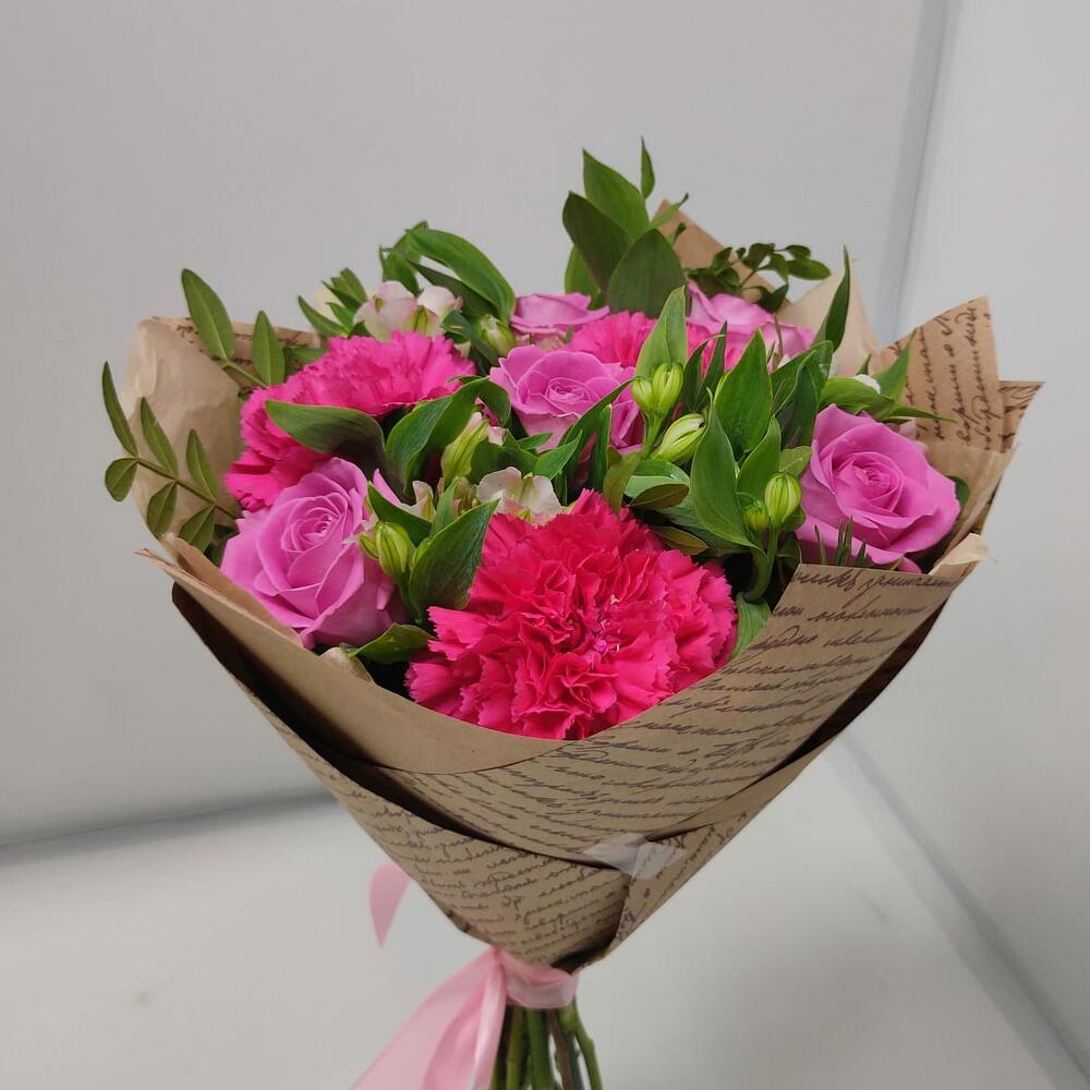 роза кения – 5 шт.Альстромерия – 5 шт.диантусы – 3 шт.зелень фисташки – 1 шт.Дизайнерская упаковка – 1 шт.