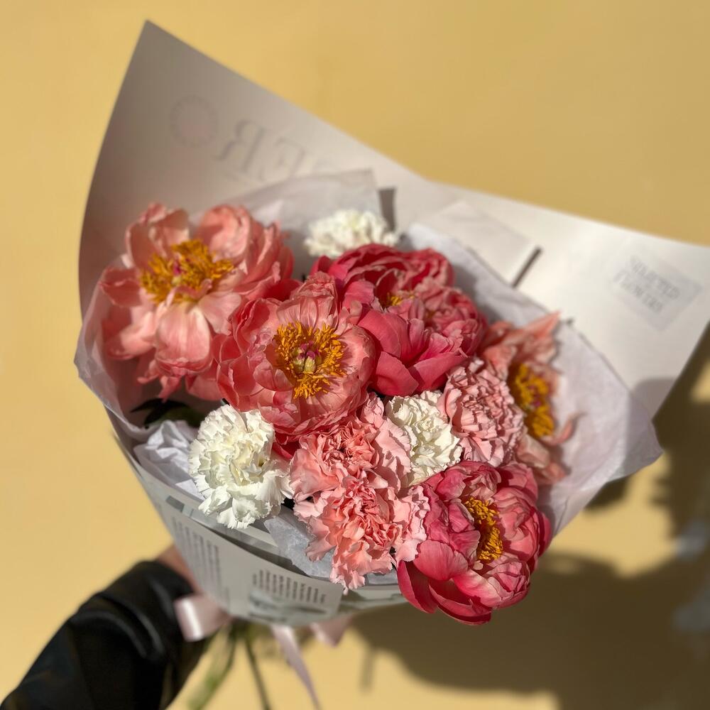 Пион Коралл Шарм (Coral Charm) – 5 шт.Гвоздика – 6 шт.Упаковка дизайнерская – 1 шт.