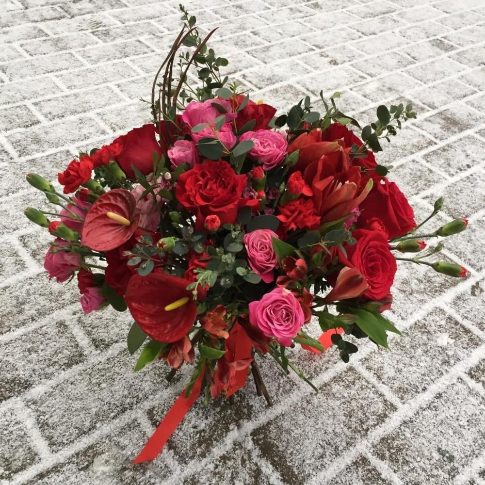 Альстромерия – 3 шт.Амариллис – 1 шт.Антуриум – 3 шт.Ваксфлауэр – 3 шт.Эвкалипт – 10 шт.Роза – 7 шт.Лента атласная – 2 шт.Диантус – 2 шт.Роза кустовая пионовидная – 4 шт.Диантус кустовой – 8 шт.