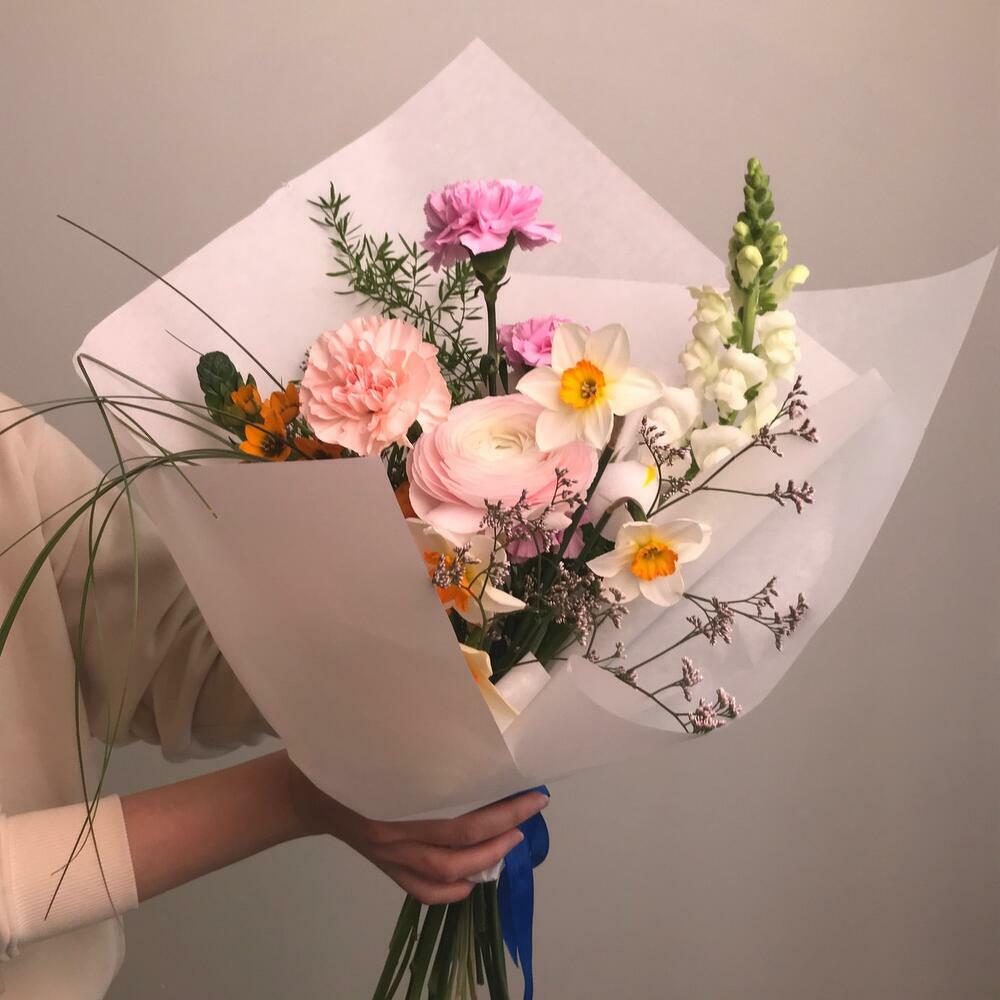 Ранункулюс – 1 шт.Ирис – 1 шт.Нарцисс – 4 шт.Гвоздика – 5 шт.Орнитогалум – 1 шт.антиринум – 1 шт.аспарангус – 1 шт.
