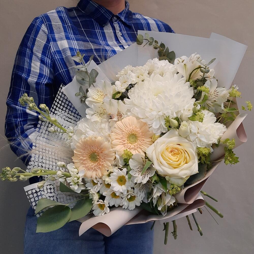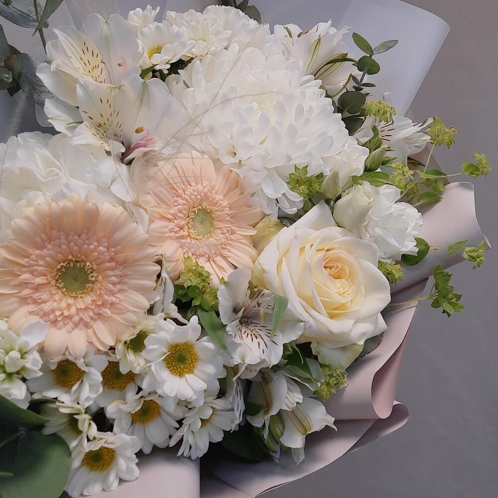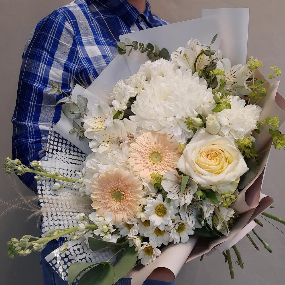 Роза – 1 шт.Гермини – 2 шт.Альстромерия – 3 шт.Сантини – 2 шт.Маттиола белая – 2 шт.Буплерум – 2 шт.Лизиантус – 1 шт.Диантус – 3 шт.ковыль (пучок) – 3 шт.Эвкалипт Baby Blue – 3 шт.Рускус – 12 шт.Упаковка дизайнерская – 2 шт.Лента атласная – 1 шт.антонов – 1 шт.