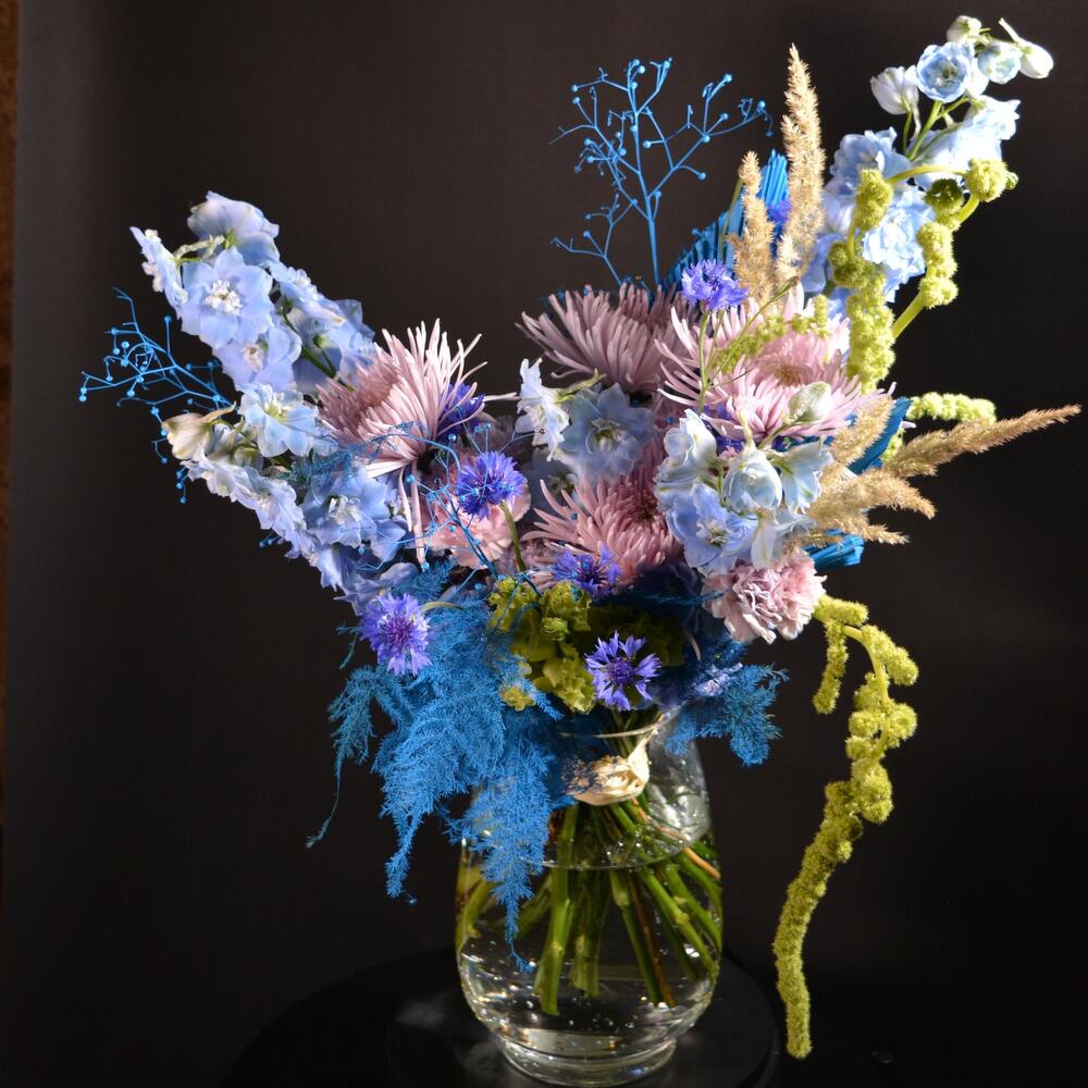 Хризантема – 5 шт.Гвоздика – 7 шт.Дельфиниум – 5 шт.василек – 7 шт.Злаки – 3 шт.Сухоцветы – 10 шт.Амарант – 3 шт.