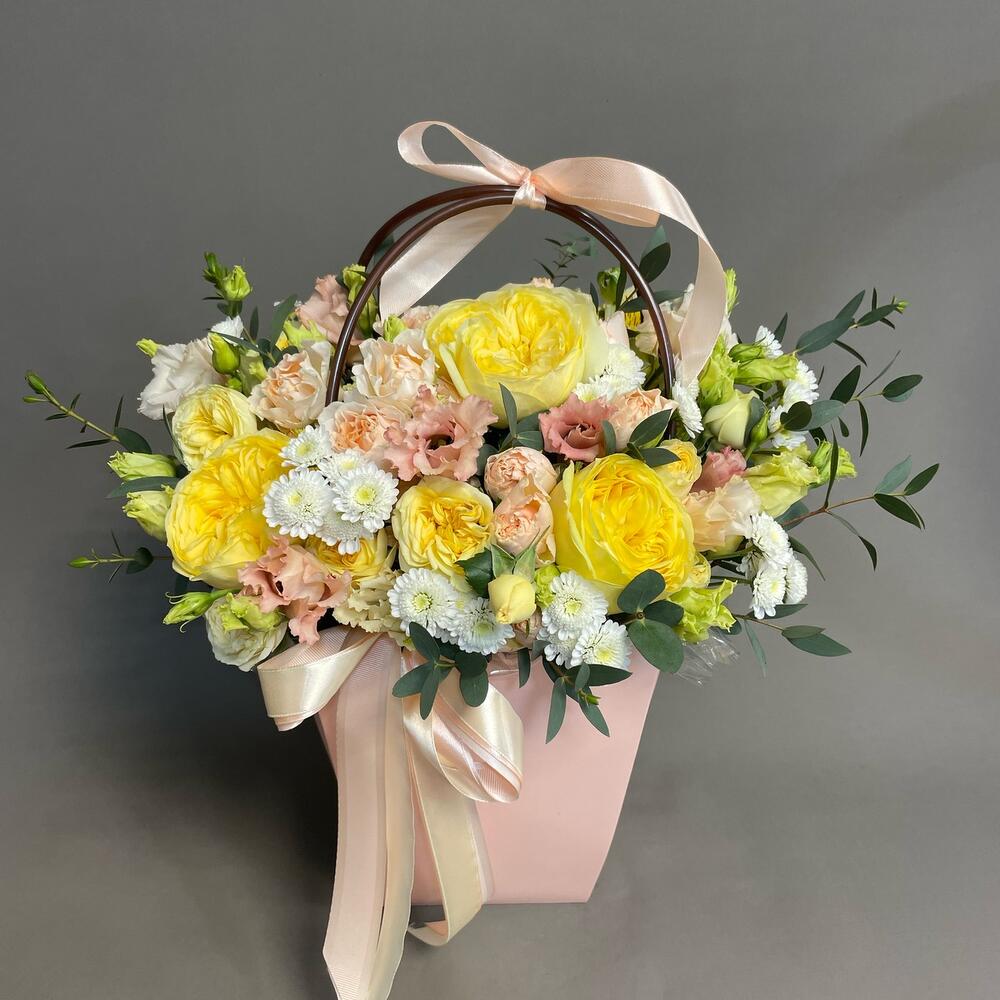 пионовидная желтая роза – 3 шт.Кустовая роза – 5 шт.Диантус – 3 шт.Диантус кустовой – 3 шт.Эустома – 3 шт.Сантини – 3 шт.Эвкалипт – 2 шт.Альстромерия – 3 шт.Сумочка – 1 шт.Оазис флористический – 1 шт.ленты атласные – 3 шт.