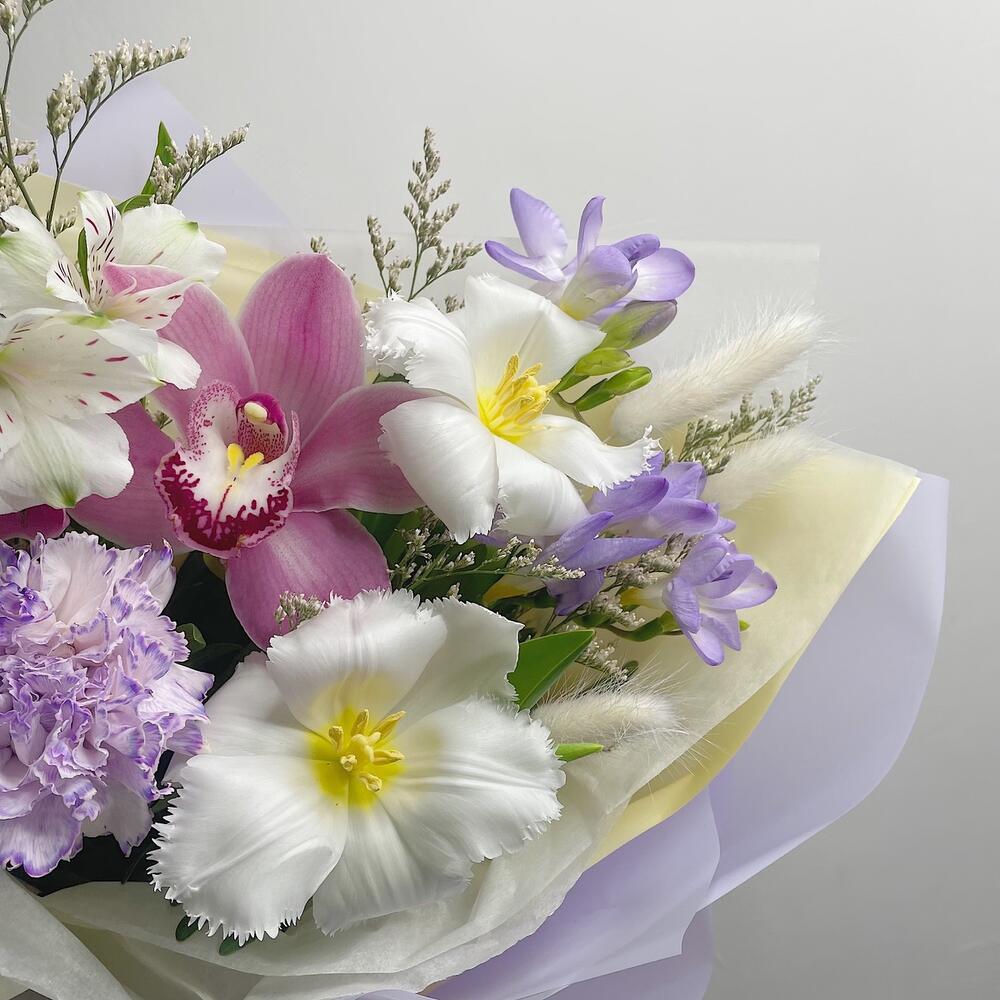 Альстромерия – 1 шт.Орхидея Цимбидиум – 2 шт.Тюльпан – 2 шт.Фрезия – 2 шт.Диантус – 1 шт.Упаковка дизайнерская – 1 шт.Лагурус – 6 шт.