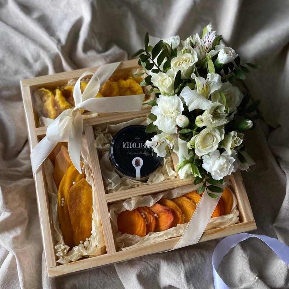 Состав:Манго натуральное сушеное 120 грПерсик натуральный вяленый 120 грАнанас натуральный сушеный 120 грРоза кустовая – 1 штГвоздика кустовая – 2 штАльстромерия – 2 штЗелень фисташки – 1 штНабор вкуснейших сухофруктов, мëда и цветов – яркое сочетание в подарок для подруги, жены, девушки, дочери, Татьяне Также подойдëт для коллеги, на подарки сотрудникам.