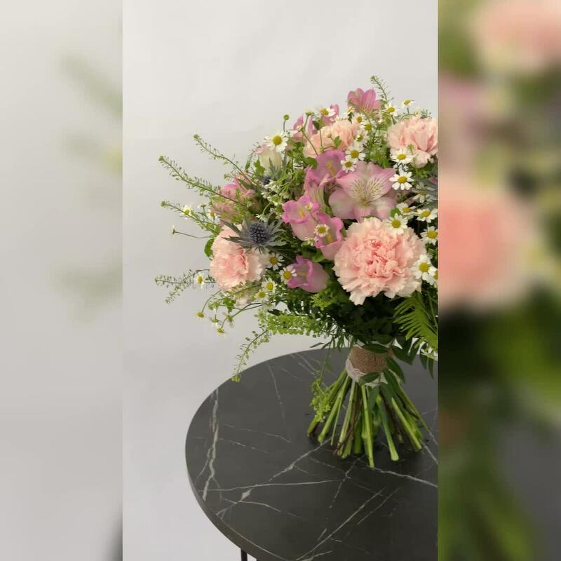 Альстромерия – 6 шт.Кампанула – 10 шт.Тласпи – 1 шт.Эрингиум – 4 шт.Гвоздика розовая – 9 шт.Ромашка кустовая – 15 шт.Фисташка – 8 шт.амбрелла – 3 шт.