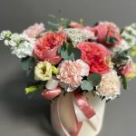 Маттиола – 2 шт.Озотамнус – 2 шт.Эвкалипт – 3 шт.Эустома – 4 шт.Лента атласная – 2 шт.Диантус – 5 шт.Коробка шляпная – 1 шт.Оазис флористический – 1 шт.розы – 3 шт.
