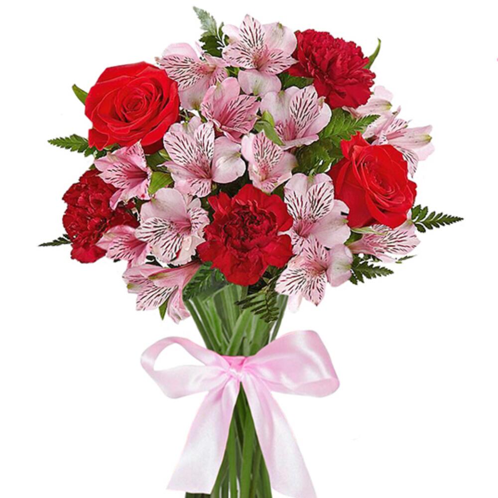 Папоротник – 1 шт.альстромерия (розовый) – 5 шт.лента атласная (розовый) – 1 шт.гвоздика одноголовая (красный) – 3 шт.