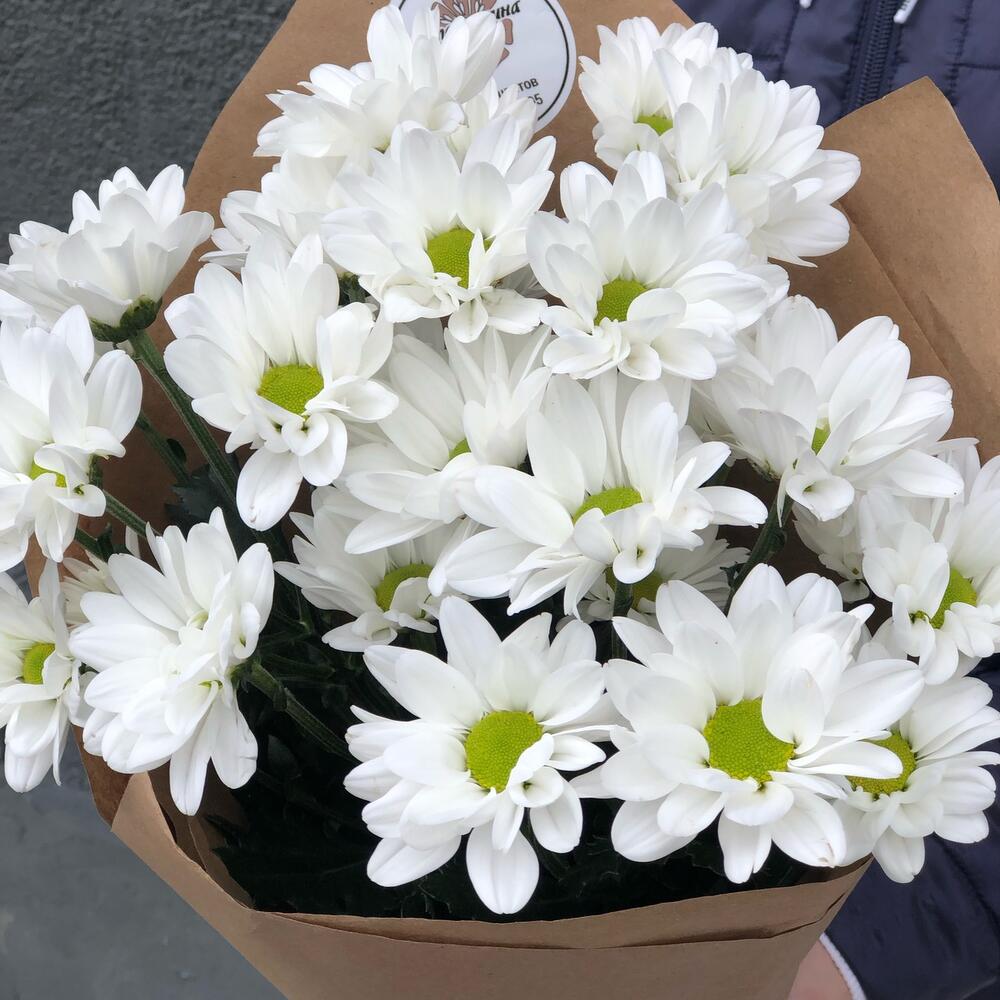 Хризантема кустовая – 3 шт.Лента атласная – 3 шт.Крафт дизайнерский – 2 шт.