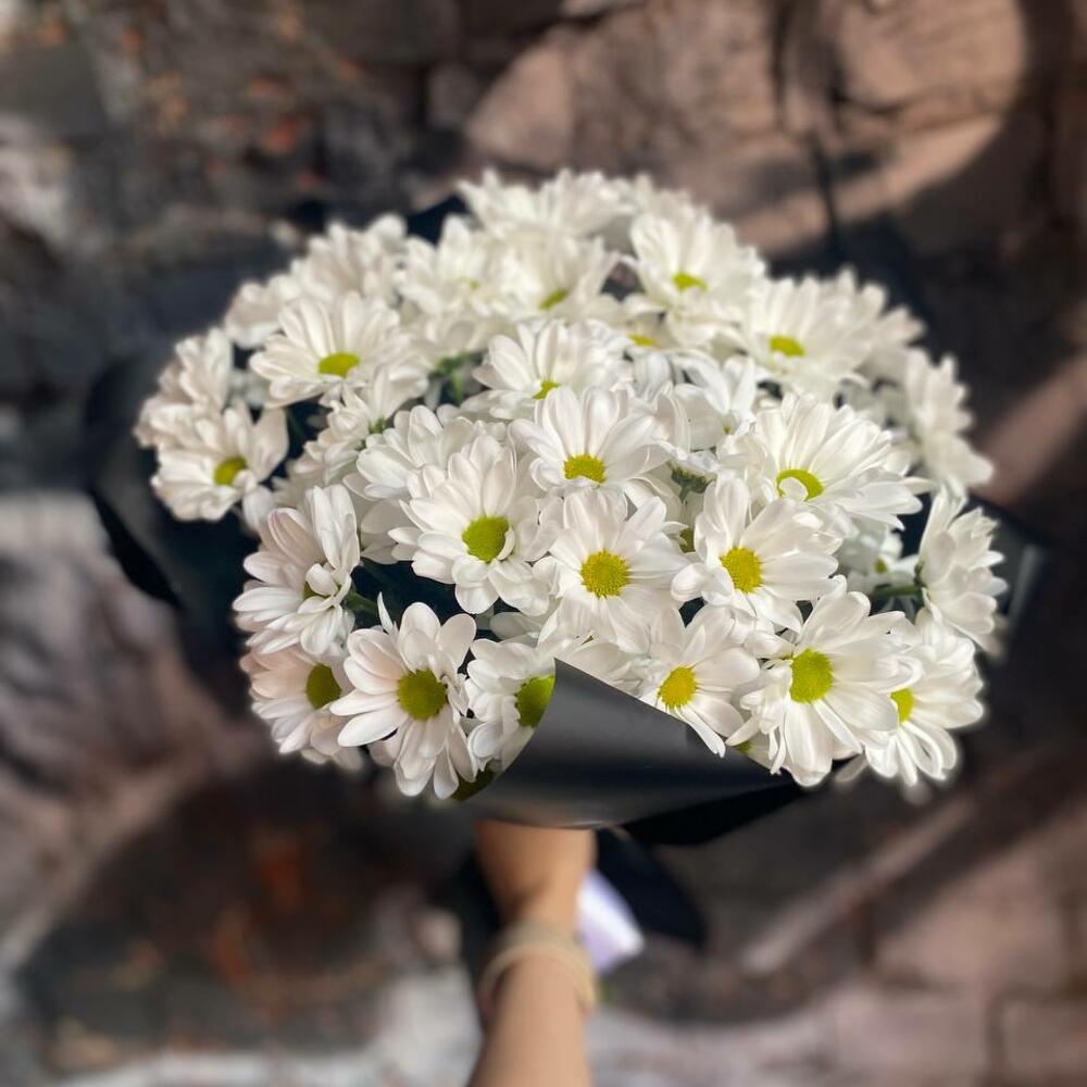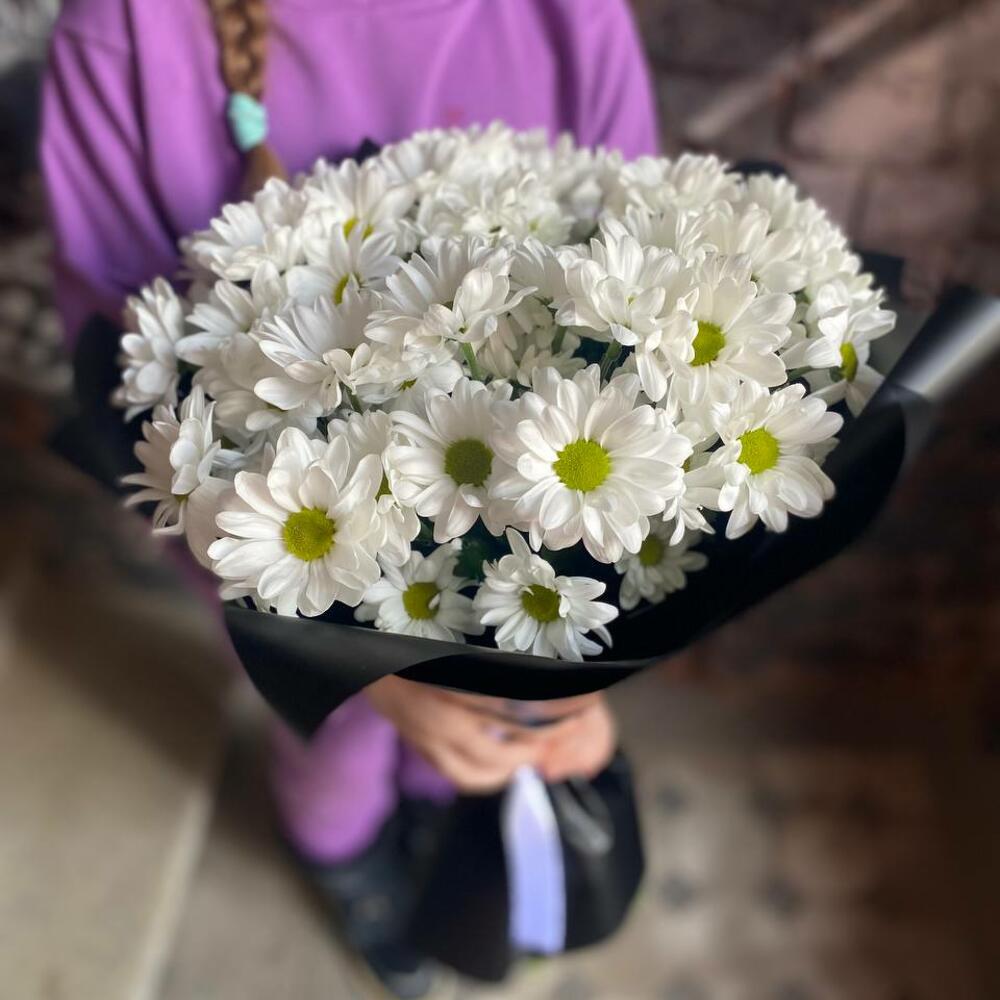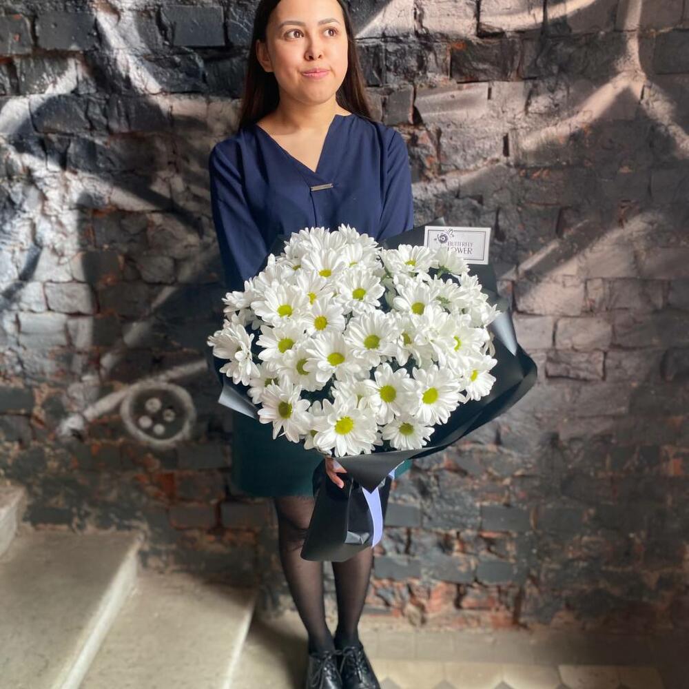 Букет из 15 белых кустовых хризантем Балтика в стильной упаковке