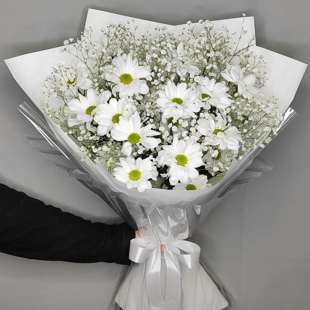 Букет из белоснежных ромашек и воздушной гипсофилы “Ромашки в снегу”