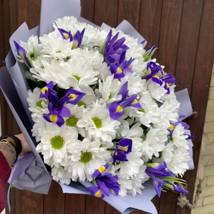 Букет из кустовой хризантемы и ирисов «Блю Мейджик»
