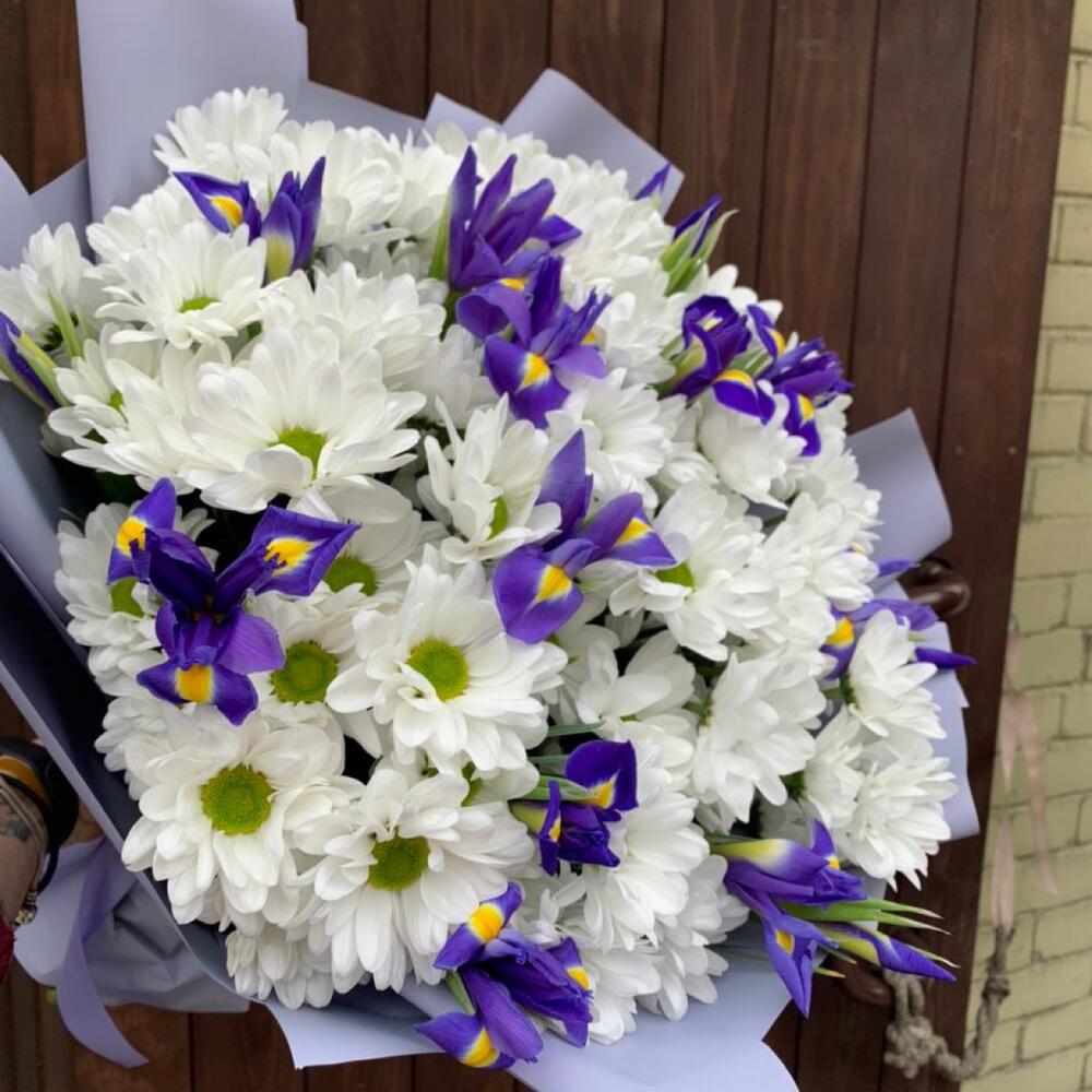 Хризантема кустовая – 7 шт.Ирис Blue Magic – 18 шт.Упаковка дизайнерская – 2 шт.Лента атласная – 2 шт.Фисташка – 5 шт.