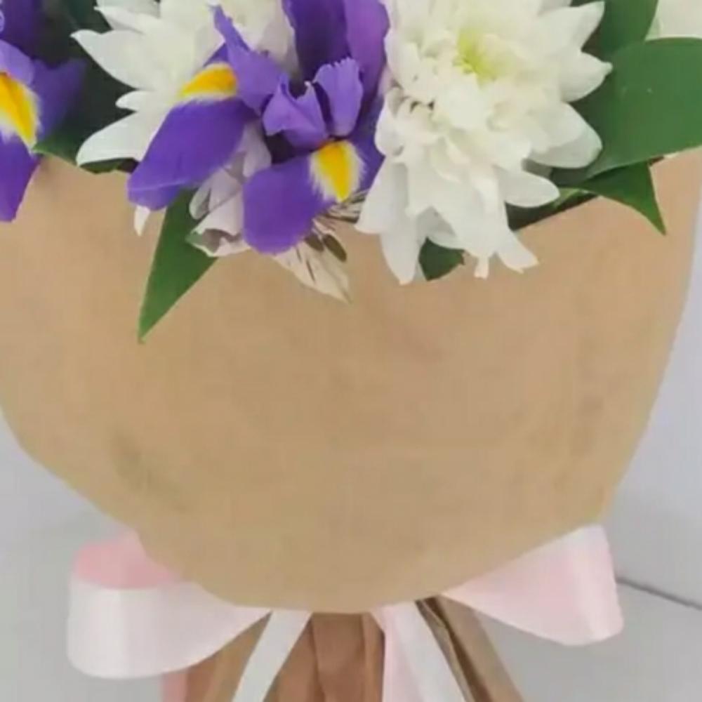 Хризантема кустовая – 3 шт.Ирис Blue Magic – 5 шт.Крафт упаковка – 1 шт.Лента атласная – 2 шт.