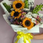 Букет из подсолнухов, матрикарии и солидаго "Рик Робертс"