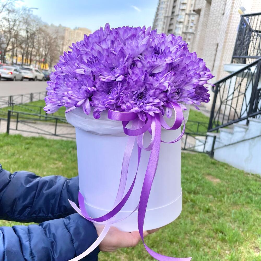 Кустовая фиолетовая хризантема в коробке
