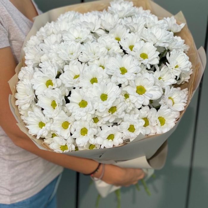Хризантема кустовая – 13 шт. Упаковка дизайнерская – 1 шт. Открыточка с вашими пожеланиями – 1 шт.