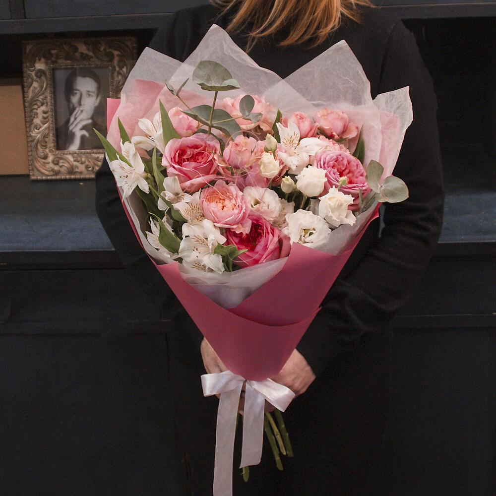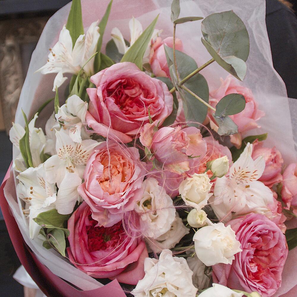Пионовидная роза – 3 шт.Кустовая пионовидная роза джульетта – 2 шт.Эустома – 2 шт.Альстромерия – 3 шт.Ковыль – 2 шт.Эвкалипт – 2 шт.Тишью – 2 шт.Пленка матовая – 2 шт.Атласная лента – 2 шт.