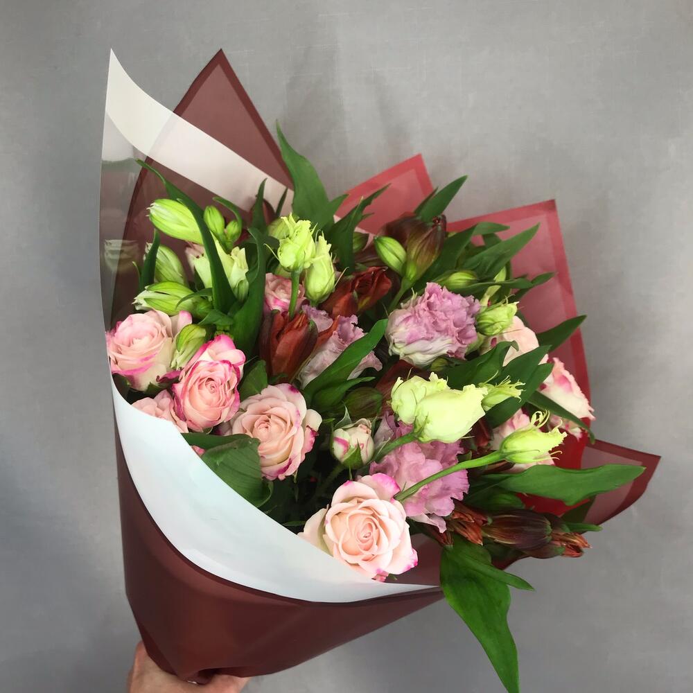 Роза кустовая – 5 шт.Альстромерия Микс Европа – 5 шт.Эустома – 1 шт.Упаковка дизайнерская – 2 шт.