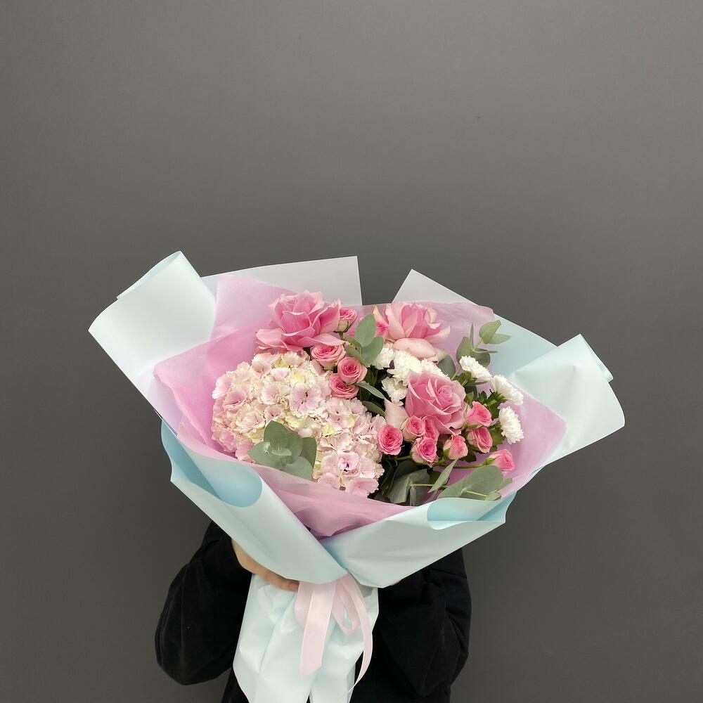 Альстромерии, Гвоздики, Кустовые розы, Лизиантусы, Розы, Хризантемы