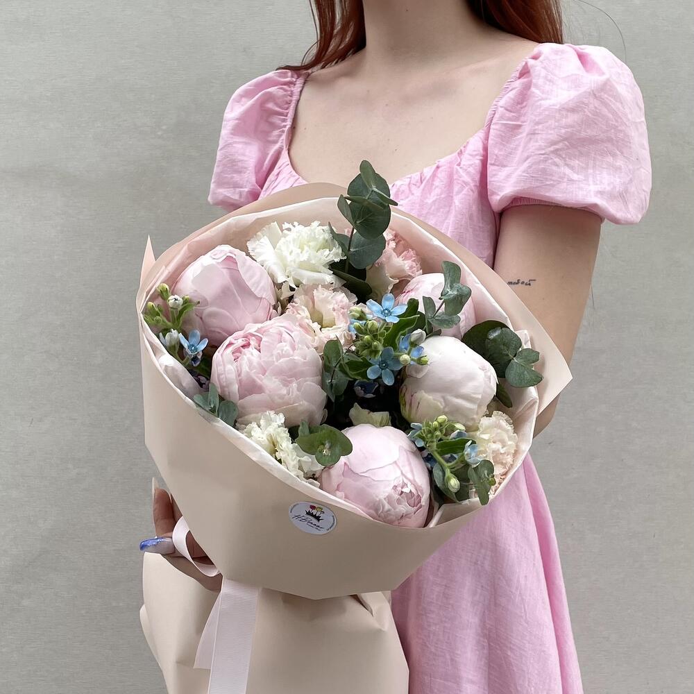 Пион – 5 шт. Твидия – 3 шт. Эвкалипт – 1 шт. Лизиантус – 2 шт.