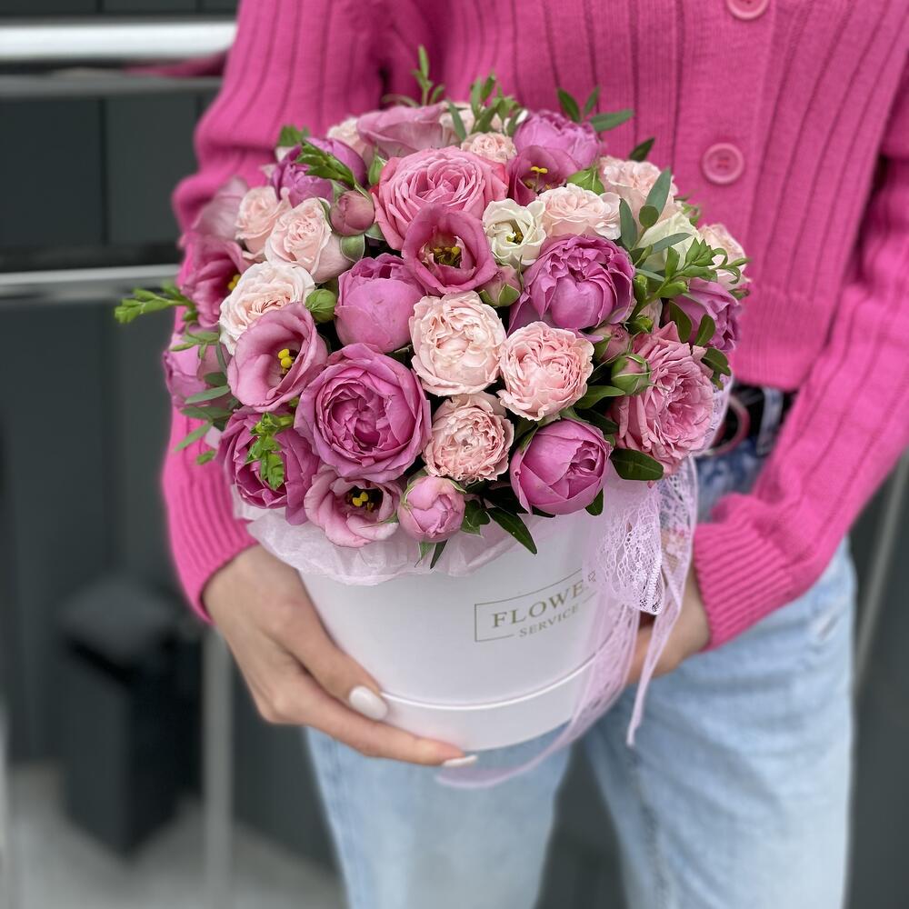Коробка Валенсия с кустовыми пионовидными розами и эустомой