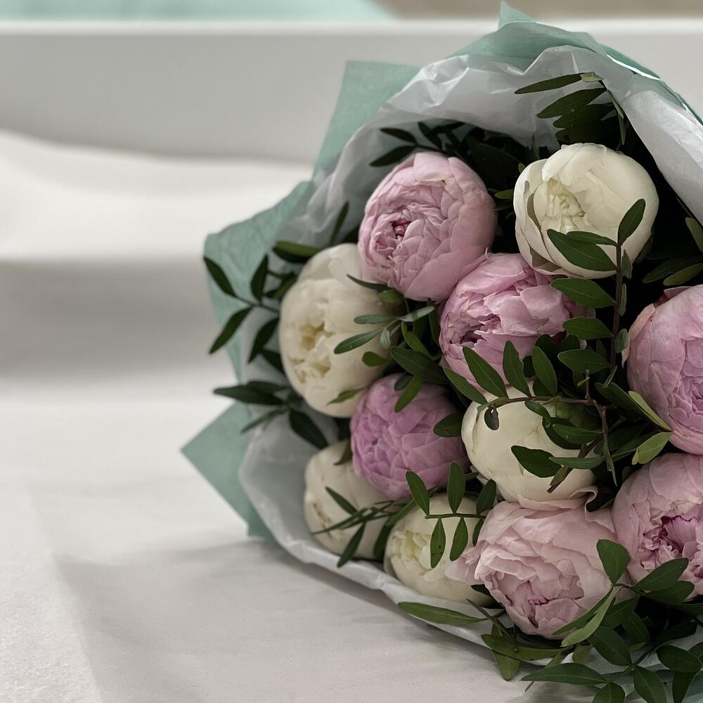 Пион – 11 шт.Дизайнерская упаковка – 1 шт.Атласная лента – 1 шт.открыточка – 1 шт.