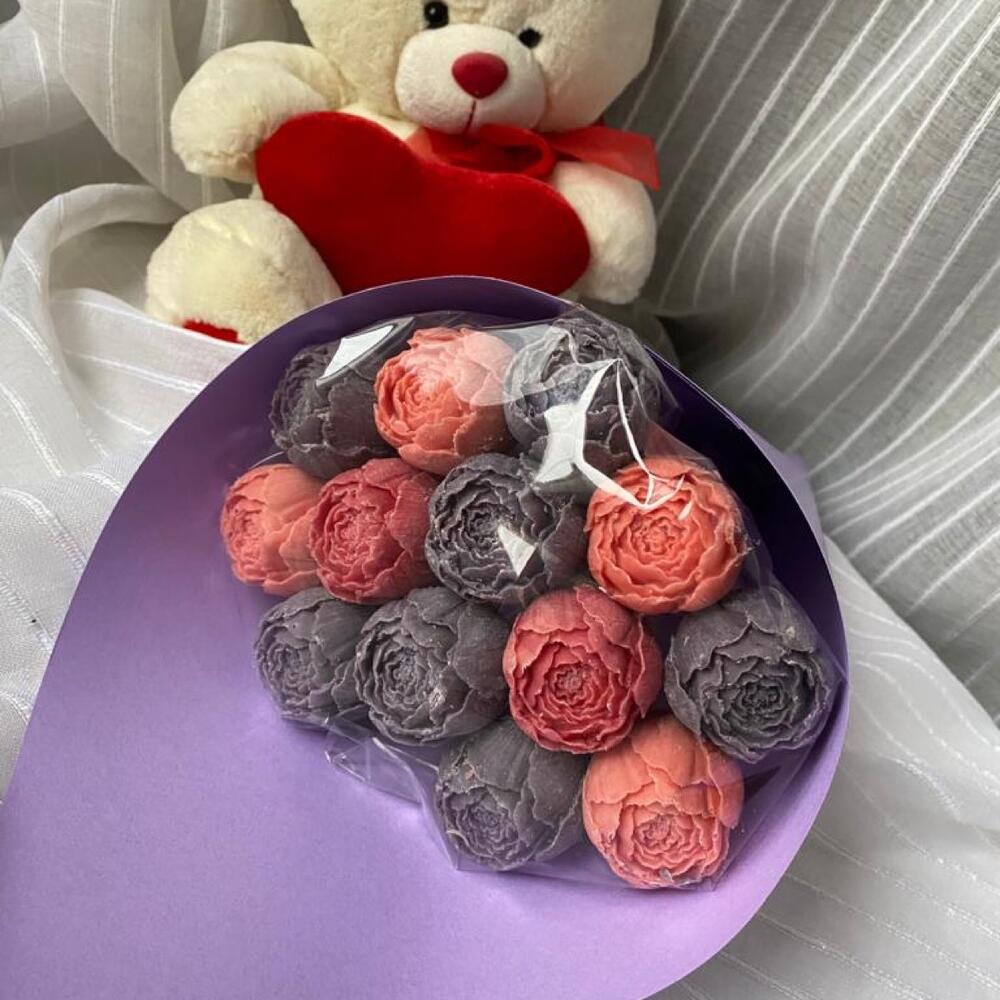 Букет из 7 Шоколадных пионов в авторской сиреневой упаковке