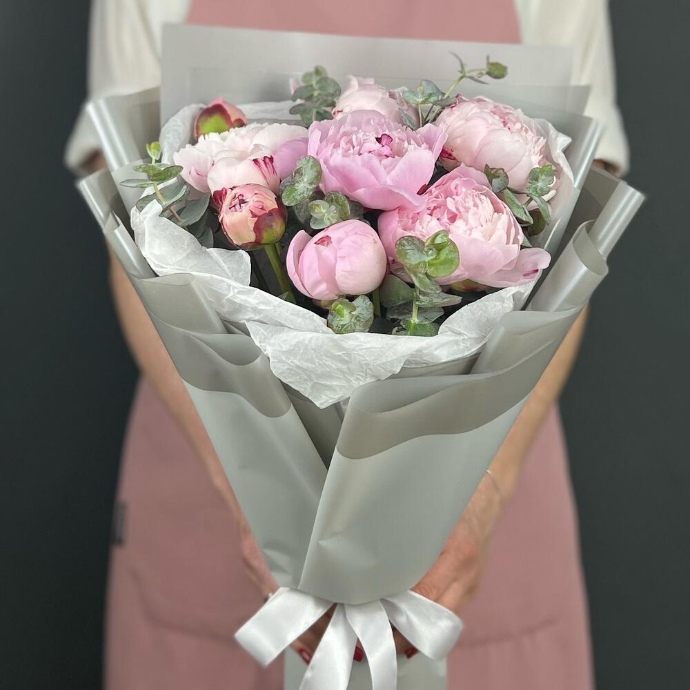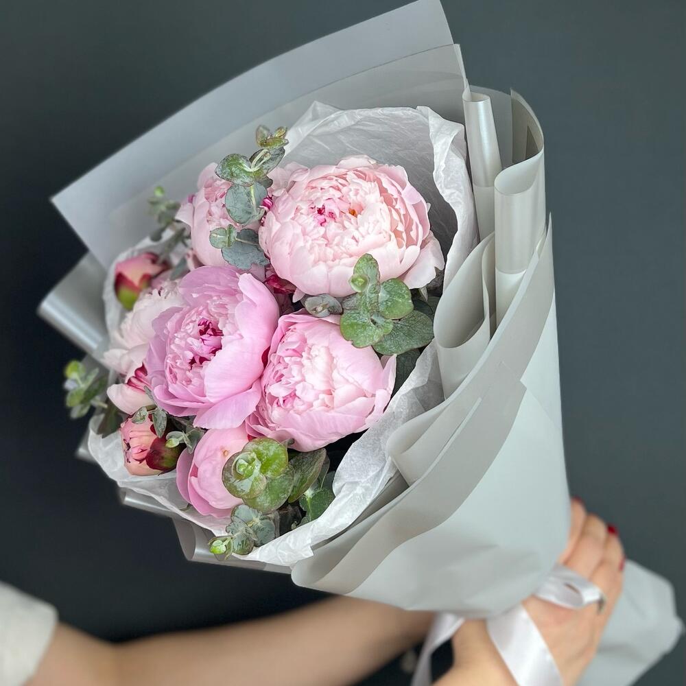 Пион – 9 шт.Эвкалипт – 3 шт.Лента атласная – 1 шт.Бумага тишью – 1 шт.бумага дизайнерская – 5 шт.