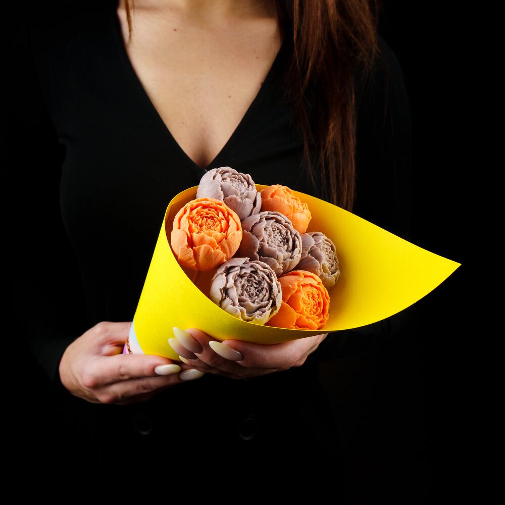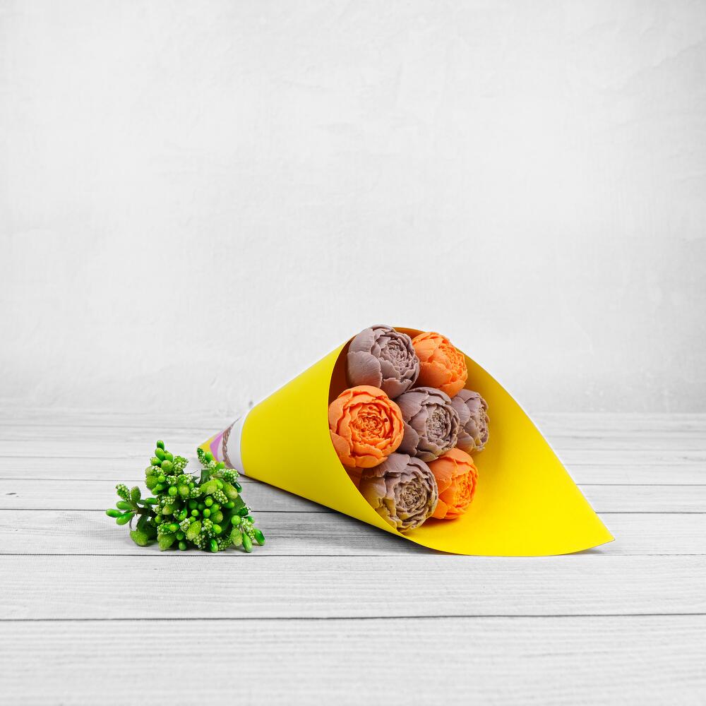Букет из шоколадных пионов оранжево-сиреневый в дизайнерском желтом картоне