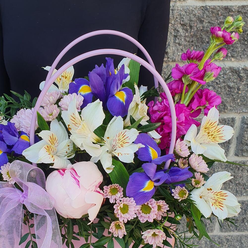Пион – 1 шт.Фисташка – 3 шт.Лента атласная – 1 шт.Пленка матовая – 1 шт.Сумочка картонная – 1 шт.Сантини – 2 шт.Альстромерия – 2 шт.Ирис – 3 шт.Маттиола – 1 шт.