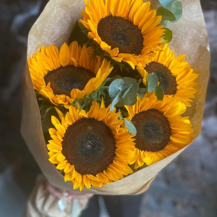 Букет из 5 подсолнухов и эвкалипта в стильной упаковке “Эбин Купер”